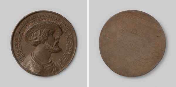 Curator: Let’s discuss this medallion of Willem I, King of the Netherlands, created around 1817 by Joseph-Pierre Braemt. The piece, made of metal, presents a portrait in profile, rendered in Neoclassical style. What are your first thoughts? Editor: Striking and cold. The patina of the metal lends an air of age, but the precise detailing of the portrait evokes a certain austerity, almost distancing. The stark profile is incredibly refined; how was this achieved, do you think? Curator: Braemt was celebrated for his medal engraving; his understanding of die-making processes allowed him to achieve such precision in relief. Metal as a medium communicates value, literally reflecting the material reality of power and currency of the monarchy during a critical moment in post-Napoleonic Europe, when royal families were restored and reinventing themselves. The manufacture of these medals often involved numerous artisans working collaboratively under the master engraver, too, each dependent on the metal suppliers. Editor: Yes, I see the point in metal choice; it’s not just about crafting a likeness but encoding worth and legacy. The portrait's composition also catches my eye. Notice the sharp angles, the clean lines. It communicates control and unwavering determination. It's devoid of sentiment, a symbol more than a person. Curator: Absolutely. Also notice the inscription around the figure, adding another layer to its message about legacy and nationhood. Editor: Indeed. Thinking about it all, what does this neoclassical treatment suggest beyond mere likeness or regal symbolism? Why return to classicism when crafting modern political narratives? Curator: The deliberate classical aesthetic reinforces ideals of leadership, harkening back to Roman virtues—a strategy many early 19th century leaders adopted, linking their rule to supposedly timeless and unquestionable virtues and thus legitimizing it to new bourgeois audiences as well as aristocracy. It's not merely aesthetic, but about embedding a complex web of power relationships via a circulating image that ties rulers and ruled within a seemingly natural order. Editor: I can see that clearly now. This seemingly simple object reveals such complex cultural and social meanings, connecting form and context seamlessly. Thank you. Curator: My pleasure. Considering production and design together offers such rich insight here.