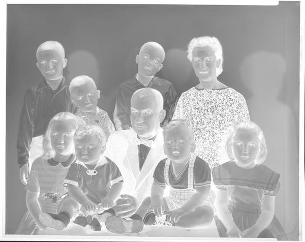 Curator: This is an untitled studio portrait by Martin Schweig of six young boys arranged from tallest to shortest. Editor: Oh, it's like a little staircase of sweet faces! But in reverse… a photographic negative. Curator: Exactly, and the materiality of this photograph is interesting. Notice the negative's edges, with the Kodak markings visible—it reminds us of its manufactured nature. Editor: It feels like a tender social study, a commentary on childhood and societal expectations of order and conformity. The negative look lends an eerie cast on the portrait. Curator: Indeed. It also encourages us to consider the labor involved in photography, from image capture to development. Editor: You're right, all that behind-the-scenes toil… I almost missed the beauty in the seemingly simple. A touching, but also slightly unsettling piece overall. Curator: Yes, seeing the process helps us appreciate the final image more.
