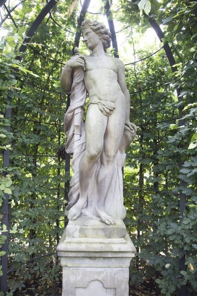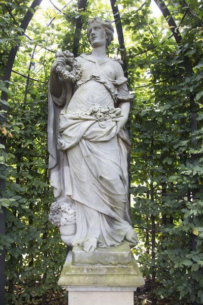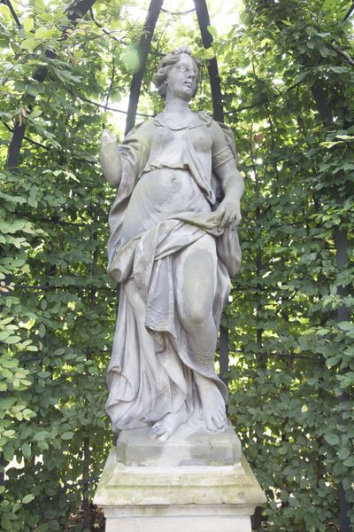 Originally, this figure probably carried a sheaf of corn in her left arm, which is the attribute of Ceres, the goddess of agriculture. So the statue represents summer, the harvest season.