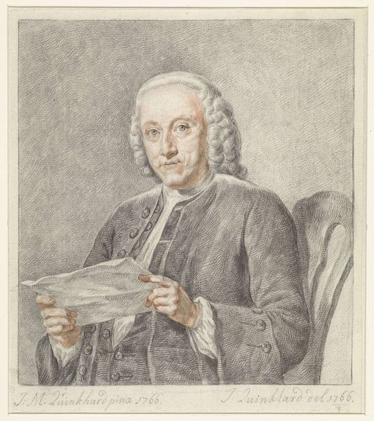 Curator: I'm immediately struck by the image’s almost dreamlike quality, the subtle chiaroscuro imbuing the scene with an introspective air. Editor: This is a print depicting Jan I Verkolje, with the portrait of his wife Judith Verheul in the background, made sometime between 1683 and 1746 by Nicolaas Verkolje. It's held in the Rijksmuseum. Curator: The placement of the oval portrait, in the upper left corner behind Jan Verkolje suggests a kind of muse-like quality. The portrait is looking downwards. How do you interpret the gaze and its symbolic implications for his artistic identity? Is she the source of inspiration? Is she looking approvingly? Editor: Notice the rendering of light, a play of textures achieved purely through line and tone, typical for engraving. This print epitomizes baroque sensibility, but also the intimacy of the Dutch Golden Age. Verkolje’s posture is very intriguing. He seems almost approachable and removed from the world all at the same time. Curator: Indeed. His direct gaze draws us in, while the artistic setting speaks to a higher plane of creation, or a more interior space. What do we read into his inclusion of his materials, that strange book-like palette that sits upon his lap? Is he signaling that love, portraiture and paint are interlinked? Editor: Precisely. Consider how Verkolje positions himself – artist and subject intertwined. The background painting becomes another layer. Through semiotics, this arrangement underscores artistic creation as an act of mediation, reflecting reality and the artist’s inner world. Curator: This work gives us a glimpse into 17th and 18th century conventions around portraiture, yet Verkolje gives us clues to how to connect the intimacy of life and love to the more cerebral work of being an artist. Editor: I'm left considering how seemingly disparate stylistic choices coalesce into this really striking, nuanced image, blending portraiture conventions with intense innerity.
