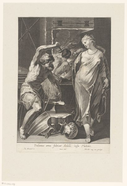 Curator: Let’s consider this etching, Bewening van Christus, which translates to Lamentation of Christ. It's an early work by Josué Dupon, dating between 1874 and 1909. Editor: It's powerfully dark. The stark contrasts in light and shadow give it a really somber, almost operatic, feel. Curator: Indeed. Dupon masterfully uses the etching technique to create tonal gradations, especially within the aged paper. Notice how he manipulates the lines to convey weight and emotion. Look at Christ's limp arm, how it directs our gaze, an artful application of the line style, echoing Baroque aesthetics in its drama. Editor: It's intriguing how the faces, especially those surrounding Christ's head, are less defined. It draws more focus onto his body, the central form within this narrative art piece. Are there any contemporary social contexts that influence this choice? Curator: Certainly, prints like these played a crucial role in disseminating religious and historical narratives to a wider audience, reflecting a societal need for easily reproducible imagery. It's compelling to note the socio-political weight attributed to depictions of suffering. Consider the function and the availability of this image in shaping collective memory. Editor: Do you feel the composition perhaps idealizes suffering? The figuration appears meticulously arranged for dramatic impact. Is it designed to elicit a certain response, and how effective do you find it today? Curator: I think the idealization serves a purpose. It aims to elevate the subject, to create a timeless, almost universal representation of grief and sacrifice. Perhaps today it speaks less to religious devotion and more to enduring human struggles and how those have been historically framed within European culture. Editor: It's true, and now seeing the delicate interplay between light and dark—its structured form alongside its cultural significance—gives it a refreshed contemporary appeal. Curator: Agreed. Examining it formally enriches its historical weight and expands what the image tells us.