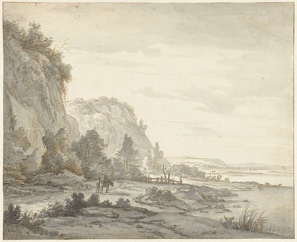 Editor: Here we have Jan Both's "Italiaans landschap," created sometime between 1628 and 1652. It's a drawing, seemingly in graphite and maybe watercolor on paper. There's such a tranquil mood to this landscape; I'm drawn to the layered composition and soft light. What do you see in this piece, from your perspective? Curator: Looking at the process is key here. Consider the materiality: graphite and watercolor. They are easily transportable. The paper support itself points to the artist’s mobility, suggesting sketches *en plein air*, directly engaging with the landscape as raw material. Editor: So, the ease of use of the materials connects directly to the artist's experience? Curator: Exactly. Both, like many Dutch Golden Age artists, travelled to Italy. But why? What material conditions allowed for this? We have to consider the burgeoning art market back in the Netherlands. Demand for Italianate landscapes fueled production. These sketches weren’t just aesthetic exercises. Editor: You're saying it's not just about pretty scenery; there's a business aspect to it as well? Curator: Absolutely. Both was producing a commodity. Consider how these "pencil drawn" or "pencil sketch" landscape artworks entered the collectors' hands, their display settings. The labor involved is worth mentioning; artistic workshops, and how landscape artistry played a part in cultural and economic consumption. The materials and process aren't separate from the social and economic context. Editor: That’s a great point. I was so focused on the artistic aspect, I didn't consider the full picture of material production and market demand behind this “sketch”. Curator: Exactly. It's about deconstructing that divide, understanding the networks of production and consumption. Editor: I'm definitely going to view landscapes differently now. It makes you think about the who, how, and why, instead of just the what!