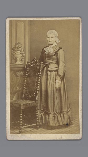 Curator: What a wonderfully evocative piece. This gelatin silver print, created sometime between 1877 and 1885 by Jannis Jacobus van Melle, is titled "Portret van een onbekend meisje achter een stoel"—"Portrait of an Unknown Girl Behind a Chair." Editor: My first impression? Melancholy. The sepia tones lend it this beautifully aged quality, but it’s really the girl’s pensive expression. She looks like she's carrying the weight of a small world. Curator: Absolutely, and there’s such artifice in how these portraits were staged, which makes me question all this Victorian melancholy. Is it genuinely felt, or constructed? You know, how much control did this girl actually have over her representation here? Was this a family commission? Editor: It’s fascinating how photography in that era—a fairly new medium, right?—became almost instantly entwined with status and class. Her dress, while sombre, indicates a certain level of affluence. It is true that there were lots of photographic studies in 19th century looking at how photography helps to classify its objects into criminal, patient, etc... However the neutral background gives her a more intimate, internal experience that doesn't necessarily place her within one of these historical classes... Curator: Yes, she’s got that wistful, almost Pre-Raphaelite look to her, so yeah that places the work aesthetically rather than historically. This might sound weird, but I get the feeling this girl could burst out laughing any second. It makes you wanna give the picture a little shake just to see what comes tumbling out. A hidden smile perhaps. Editor: It is certainly tempting to release her to make a different decision, but doing so in practice requires an active and deliberate reading practice. Reading practices is to view subjects within the pictures of that time as more than props that were fixed... Instead as subjects with possibilities. Curator: Beautifully put. I also see possibilities when I look at her eyes, though the mystery is probably a big part of the allure. Editor: Absolutely. It allows for the projection of all kinds of feelings—an exercise, for me, in attempting to disrupt historical assumptions about women and representation, you see. To liberate a little, by reimagining. Curator: Reimagining can indeed be a liberation! Maybe all great art is actually just one huge, collective daydream... Editor: It is one we continue to actively reshape. Thank you.