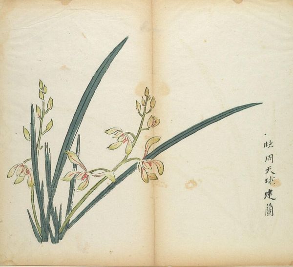 Curator: This is "Plum Blossoms and Narcissus," an illustration by Hu Zhengyan from the Ten Bamboo Studio Manual of Calligraphy and Painting. Editor: Ah, it's so delicate! The flowers feel like they're barely there, like a fleeting dream. Curator: Indeed, Zhengyan's manual was incredibly influential in popularizing color printing techniques. It allowed for subtle gradations and layering. Editor: I love how the narcissus stalks reach upwards, almost pleading, while the plum blossoms seem to float serenely in the lower corner. Curator: The manual democratized art-making, making sophisticated imagery accessible beyond elite circles through affordable prints. Editor: Thinking about the hand that guided the brush and carved the woodblocks, it adds another layer of depth to this seemingly simple composition. Curator: Absolutely, understanding production alters our perception of value and artistry. Editor: It’s funny how this tiny image can hold so much history, technique, and whispered emotion.