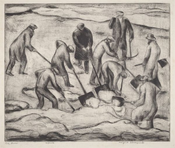 Curator: Fred Nagler's etching, "The Drought," created around 1936, presents a powerful depiction of human suffering. What are your initial thoughts? Editor: My first impression is one of collective anguish. The stark, monochrome palette heightens the emotional weight, doesn't it? There's a feeling of desperation communicated through the upward thrust of the figures’ arms, yet the tight composition nearly suffocates them. Curator: It's interesting you say that. Looking at this print through a historical lens, Nagler likely aimed to capture the dire realities of the Dust Bowl era in the United States. We have emaciated figures, their faces etched with despair, set against a landscape implicitly ravaged by environmental catastrophe. The raising of arms could equally be supplication or a challenge, couldn’t it? Editor: Absolutely. It reflects a pivotal historical juncture. Consider how race intersects here: who suffered most during these calamities and why? Are these arms raised in collective demand of the social policies that continue to enable class-based disasters today? There's also a distinct absence of any single dominating figure; it underscores collective action, as well. Curator: And I think the lack of individual prominence certainly feeds into a broader narrative of systemic failure. It is not the fault of the individual, rather it exposes governmental policies or social infrastructures unable to respond adequately to widespread need. Notice how the realism amplifies the palpable nature of historical pain. Editor: Definitely. The bodies are rendered almost raw, devoid of romanticism, driving home the raw intersection of human bodies, class-based exploitation, and ecological destruction. Curator: Indeed. Nagler successfully translated societal failures into potent imagery, making "The Drought" not merely a historical document but a stark reminder of enduring vulnerabilities. Editor: An evocative artwork that forces us to contemplate how histories of environmental injustices are repeating themselves today.