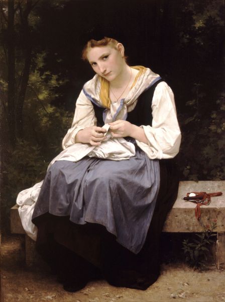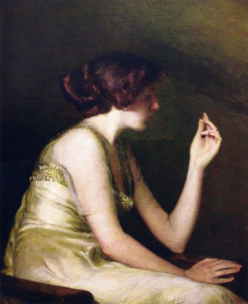 Curator: Adrian Gottlieb's "Second Thoughts," a painting rendered in oil, immediately evokes a sense of introspective quietude. Editor: Absolutely. The limited palette—whites, creams, and dark browns—intensifies that feeling of stillness. She seems caught in a private moment, a visual echo of a deeper psychological state. Curator: Precisely. Gottlieb works within the grand tradition of figurative realism and portraiture, but the very title subtly acknowledges a self-awareness of those genres. This work enters into dialogue with art history, in its gestures and aesthetic, while subtly commenting on its codes of conduct. Editor: Yes, and even though the painting presents a recognizable scene of quiet contemplation, I find myself focusing on her hands and that barely-there ring, laden with implicit narratives of domesticity, commitment, or perhaps constraint. It could symbolize any transition. Curator: I agree. These traditional postures, along with what might seem to be a wedding ring, carry specific social connotations that invite scrutiny, which also subtly nods at a self-awareness of performative feminine roles. Editor: Indeed. What stands out to me, then, is the play between outward calm and inner turmoil—the composed figure against what might be some inner questioning. I see not just a woman, but an idea of womanhood and its enduring weight. Curator: Exactly. This painting reminds us of the ever-present tension between an individual and the forces acting upon their world, shaping even our private 'second thoughts'. Editor: Gottlieb prompts a kind of mirroring in the viewer. Looking at her is like catching a glimpse of ourselves reflecting on our own journeys.
