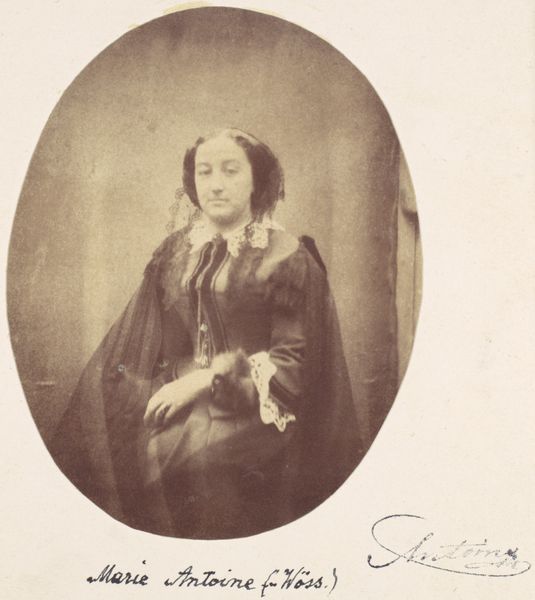Editor: So this is “[Portrait of an Elderly Woman]” taken by Franz Antoine, sometime in the 1850s or 60s. It’s an albumen print. It has a gentle and serene feeling about it... what strikes you most about this work? Curator: What resonates with me is the quiet strength in her gaze. Think about the historical context: This was a time when photography was emerging, offering a new, accessible way to document life, yet portraiture remained a luxury. For a woman of this age to be captured, likely meant she held a certain social position or represented something of value within her community. Do you notice the way her clothing, particularly the lace bonnet, signals a certain level of respectability and adherence to societal norms? Editor: Yes, there's definitely a formality to it. It also seems to hint at her role in society, maybe motherhood or a position within the church? Curator: Precisely! These photographic portraits often served as markers of identity, solidifying one's place within the social fabric. And the very act of creating this image was an assertion of agency, a claiming of space in a rapidly changing world. The albumen print, with its delicate tones, further enhances that sense of history, offering a glimpse into a bygone era. Does that understanding change how you view the "gentle and serene" quality you mentioned earlier? Editor: Definitely, it adds a layer of resilience, of navigating a world with defined roles, but finding a way to leave a mark, however subtle, even in old age. Curator: It reminds us that even within the constraints of gender and social expectations, women have always sought ways to express their identities and exert their influence. I am more reflective when examining it from that perspective. Editor: That gives me so much to think about! Thank you!