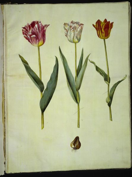 Hans Simon Holtzbecker rendered these tulips in delicate watercolor. In 17th-century Europe, the tulip wasn't just a flower; it was a symbol of wealth and status, reaching feverish heights during "Tulip Mania." Note the striking, flame-like patterns on the petals. This "broken" effect, caused by a virus, ironically increased the tulip's value, resembling the coveted patterns seen in precious textiles and exotic plumage. We find echoes of this floral infatuation in earlier Dutch still lifes, where flowers represented not only beauty but also transience and vanity. Consider how, across cultures, flowers often embody ephemeral beauty and the cycle of life. From ancient Egyptian lotus motifs symbolizing rebirth, to the Victorian language of flowers, where each bloom carried a specific sentiment. The tulip's unique story, however, intertwines beauty with economic frenzy, a potent reminder of our collective desires and follies. This beautiful image is steeped in the complex interplay between nature, commerce, and human psychology.