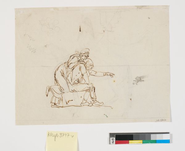 Curator: Nicolai Abildgaard created this ink and watercolor drawing, "Udkast til dørstykke af den katolske religion," between 1802 and 1805. It currently resides at the SMK, the National Gallery of Denmark. Editor: It looks like a preliminary sketch, with a sense of immediacy conveyed through the raw, almost frantic lines. Curator: Indeed. Abildgaard was known for his neoclassical and Romantic style, emphasizing form and composition. Note the figure's carefully posed contrapposto. The minimal use of color—just washes of ink—underscores the linearity and reinforces the emphasis on form over pure surface effect. Editor: I see more than mere formalism here. It is clearly a study but reveals a glimpse into Abildgaard's working process. The material constraints are visible; the economical use of ink, the rapid strokes, hint at a scarcity or perhaps just an urgency. It almost feels as if this drawing functions like a material meditation, grappling with complex ideas using the humblest of means. Curator: Intriguing perspective. Abildgaard was working in a time of upheaval. I find that the classical elements he employs are laden with complex allegory relating to the relationship of faith and order. There is an implied structural harmony reflected in the very act of drawing which lends a stability against external change. Editor: But what does it mean to focus on form when societal foundations were fracturing? I wonder if the materiality— the bare paper, the quick ink— offers us an immediate understanding of this era beyond just abstract aesthetics. The labor involved appears stark. Curator: An interesting lens for inquiry, considering the societal context in which it was made. Viewing this through material applications allows different interpretations regarding the work and artistic vision. Editor: This work shows so much when we examine materials and context! I come away understanding it not just as an aesthetic exercise, but also an exercise in economical expression. Curator: Yes, precisely! We can both appreciate its artistic merit and see it in a richer, socio-historical manner.