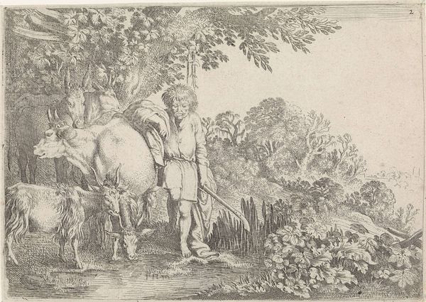 This print of "Prophecy of Jeremiah" was made at an unknown time in the Netherlands, by an anonymous artist. The image presents the biblical prophet Jeremiah in a Dutch forest landscape, accompanied by a lion. The lion is a direct illustration of a biblical verse, quoted in Latin below the image, which states ‘My heritage has become to me as a lion in the forest, it has lifted up its voice against me; therefore I have hated it.’ The lion's presence and the verse’s sentiment reflect the social and religious upheavals of the time, particularly the tensions between established religious institutions and dissenting voices during the Reformation. This print probably circulated as part of a polemical pamphlet, which shows how artists and publishers at the time harnessed imagery to engage in theological debates and critique the established order. To truly understand the print's significance, researchers might delve into pamphlets from the period, exploring how religious reformers deployed imagery to challenge conventional beliefs. By examining this and the institutional context in which it was created, we can understand art’s potent role in shaping and challenging social norms.