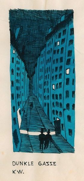 Editor: This painting, "Street Tonight" by František Hudeček, was created in 1944 using acrylic paint. The colors are intensely blue and evoke an unnerving urban mood. How do you interpret the composition and style? Curator: The visual arrangement is of interest here. We observe a calculated manipulation of form and color to convey a specific expression. The intersecting lines, the almost regimented application of paint, give a fragmented sense, reflecting perhaps the fractured experience of modern life, its unsettling geometric precision, during wartime? Editor: So, the abstract cityscape mirrors real life by rejecting smooth lines in favor of cubist fracturing? Curator: Precisely. Note how the recurring vertical red lines, suggesting perhaps street lamps, serve as visual anchors amidst the chaos of geometric abstraction. Consider how these vertical strokes are visually contained against the dominant blue palette that pushes the city toward the sky. Editor: So, this is a push-pull, up-down interplay of line and color that locks the abstract cityscape into a tense, visible plane? Curator: An astute observation. It prompts us to examine Hudeček's technical skill: each shape's sharp edges highlight their self-contained relationship with the overall form. What purpose, then, might Hudeček be trying to serve with this calculated visual arrest? Editor: To make visible an urban form by painting out what it contains! I now see a new and vibrant geometry here. Curator: Indeed. We can see a painting made out of reciprocals between forms, each shape playing against the other to emphasize this cityscape's palpable architecture.