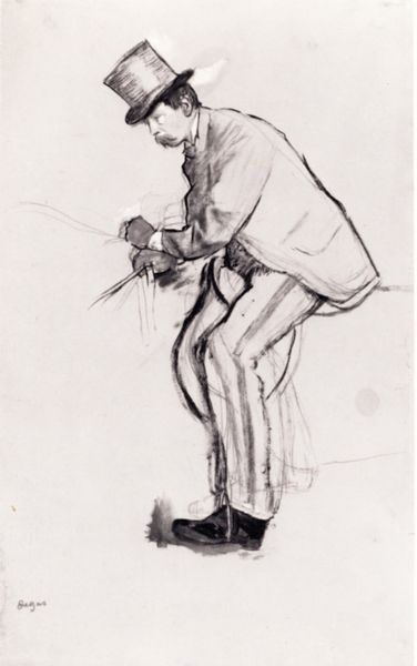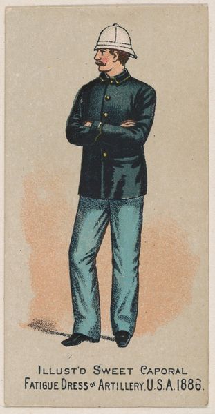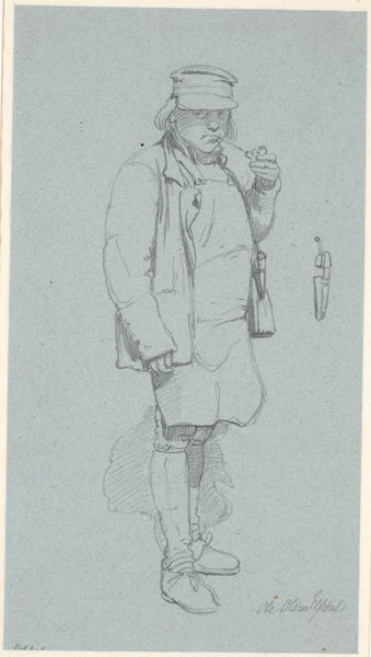 Editor: Here we have "Standing Soldier with a Gun in his Hand", an engraving by Isaac Weissenbruch, made sometime between 1836 and 1912. I'm immediately drawn to the intricate linework. How do you interpret this work through its visual elements? Curator: The density of the hatching creates volume and texture. Note how the lines defining the soldier's uniform differ in direction and spacing from those delineating the background, which, although minimalist, creates an unambiguous depth. It’s fascinating to see how such an image emerges purely from tonal gradations produced by line. Do you observe a hierarchy in the composition? Editor: Definitely, the soldier is the clear focal point, made to pop using the contrast between dark lines and the brighter background. How does the artist achieve such clarity, despite using only lines? Curator: It is the calculated use of line weight and density. Thicker, more concentrated lines emphasize the contours and inner modelling of the figure. The relative absence of such marks in the surrounding field immediately establishes spatial relationships. Note how the artist even uses varied marks to indicate the direction of light across form. Can we call this realism? Editor: Well, in the traditional sense, maybe not entirely. It is representational, yet clearly filtered through the unique capabilities and limitations inherent to the engraving medium. Perhaps “realism” with qualifications? Curator: Precisely. The visual language becomes a mediator; transforming reality into something subtly distinct. Its deliberate structure invites extended contemplation on its status as both art object and historical document. What have you gleaned overall? Editor: That the art isn't simply about mimicking reality, but about how the means shape perception, revealing its structure. Thanks, this was an enlightening formal exploration.