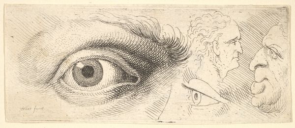 Curator: Jusepe de Ribera's "Studies of Eyes" presents us with a series of meticulously rendered eyes, each subtly different in expression and form. Editor: There’s an almost unsettling intensity in these studies. It's like being observed, scrutinized, even by seemingly passive glances. Curator: Ribera, born in 1591, clearly sought to understand the nuances of human expression through the eyes. They have long been considered the windows to the soul. Editor: Absolutely. And the fact that these are disembodied eyes allows us to focus solely on the gaze itself, perhaps reflecting the power dynamics inherent in looking and being looked at. The male gaze for instance. Curator: The graphic quality, the stark contrast, heightens the visual impact, reminding us of the enduring power and mystery of the human gaze. Editor: It’s a potent reminder of how much we communicate, consciously or not, through this singular feature.