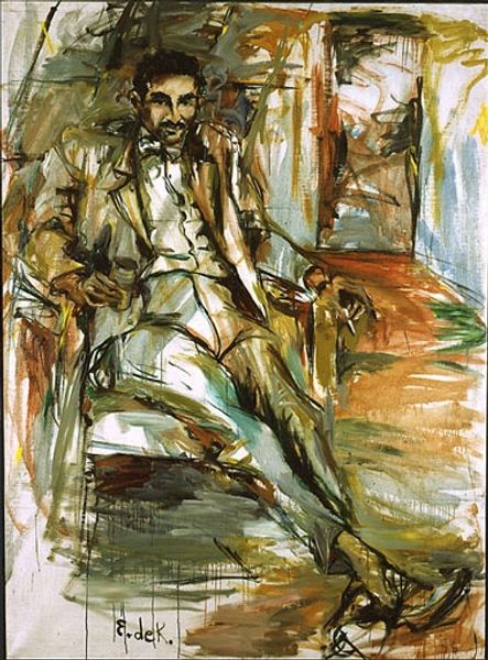 Editor: Here we have Alice Neel's "Portrait of Timothy Collins," created in 1971 using oil paint. I'm immediately struck by the vivid color palette, particularly the juxtaposition of the cool blue suit against that striking orange background. What social or cultural narratives do you think Neel is exploring in this portrait? Curator: Neel's portraits often challenged conventional portraiture, which traditionally served as affirmations of power and status. By 1971, she was deeply engaged with counter-cultural movements. How does Timothy Collins's appearance, from his pose to his fashion, seem to reflect or resist those social currents? Editor: Well, he’s wearing a very stylish, perhaps even flamboyant suit, but his expression seems… uncertain, or maybe even a little sad? It’s an interesting contrast. Curator: Exactly. Neel captures a certain tension in her subjects. This was the era of shifting social norms, of challenging established authority. The painting makes me think about the rise of individualism within consumer culture and the anxieties related to image and identity during this time. Consider the use of that very modern plastic chair. Is she suggesting that traditional structures are being replaced by something more transient? Editor: That’s a really interesting point about the chair. I hadn't thought of it that way. The whole portrait feels less about celebrating an individual and more about placing him within this specific cultural moment. Curator: Indeed. And thinking about the art world at this time, how do you see Neel's unflinching style, her focus on psychological depth rather than idealization, fitting into the larger art market? Editor: I guess it pushes against a lot of the commercial expectations for portraiture, maybe asserting a different kind of value? Curator: Precisely. Neel reclaims portraiture as a space for social commentary, for examining the complexities of human experience outside of conventional representation. It makes us consider the public role of art in challenging societal norms and questioning power dynamics. Editor: This really makes me reconsider the relationship between the sitter and the artist and how historical context influences everything in the portrait. Curator: And that's why art history matters, not only for appreciating aesthetics but for understanding ourselves.