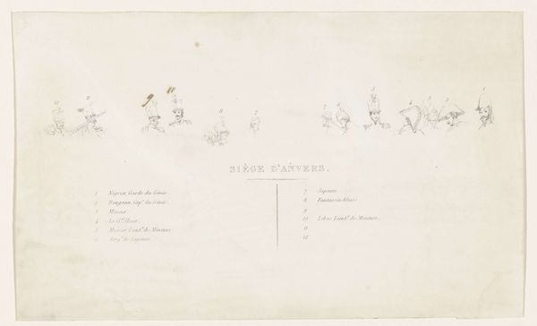 Jan Anthonie Langendijk Dzn created this key to the print of the Battle of Waterloo around 1815, rendered in pen and ink. Langendijk's career as a draughtsman coincided with a period of immense political and social upheaval in Europe, with the rise and fall of Napoleon Bonaparte. This key offers more than just identification; it provides a glimpse into the power dynamics of the time. The artist meticulously sketches the figures of authority, contrasting the leaders with the obscured mass of soldiers. It invites us to consider whose stories are deemed worthy of representation and remembrance. Langendijk’s detailed, yet detached style can be seen as a reflection of the shifting allegiances and nationalistic sentiments stirred by the Napoleonic Wars. Consider how this key challenges traditional war narratives, inviting contemplation on individual roles within grand historical events. How does it feel to view history through such a personal lens?