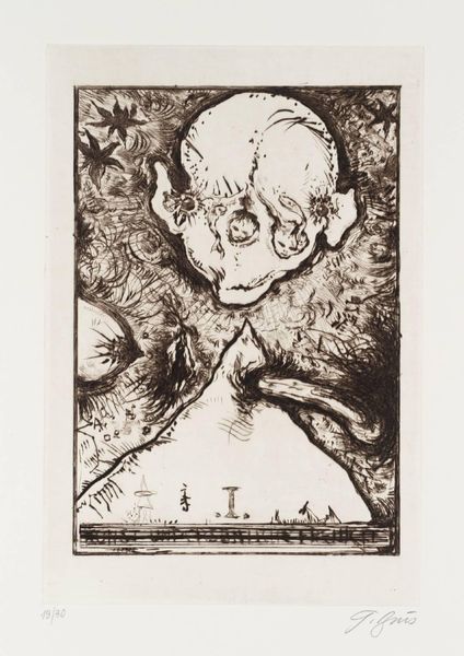 Editor: This etching by Günter Brus presents a haunting image. I’m struck by the disembodied head and the eerie figure beside it. What can you tell me about the context of this work? Curator: Brus was a key figure in Viennese Actionism, a movement known for its provocative and often shocking performance art. Considering this, how might this print engage with the socio-political climate of post-war Austria, a time marked by suppressed histories and anxieties? Editor: So it's a reaction to the politics of the time. Curator: Exactly. Works like this challenged the conservative cultural norms and forced a confrontation with repressed memories. The imagery, the distorted figure, it's all part of a visual language meant to disturb and provoke reflection on those norms. Editor: That makes so much sense! It’s not just a strange image; it’s a statement. Curator: Precisely. Art is always interacting with its context. Editor: Thank you; I'll consider that going forward.