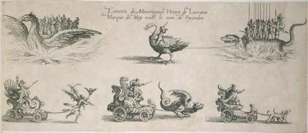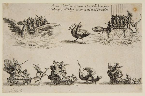 Curator: Jacques Callot created this detailed etching, "Entry of Monseigneur Henry de Lorraine," and immediately, the fantastical, almost dreamlike quality strikes me. Editor: It reads as a pageant, perhaps a political procession, but filtered through the lens of mythology and dynastic power. Curator: The composition is fascinating. Observe how the figures, each atop elaborate creatures, are meticulously rendered, demonstrating Callot's mastery of line and detail. Editor: Indeed, and considering the history of the Lorraine family, the pageantry emphasizes themes of sovereignty, authority, and the carefully constructed narratives of elite identity. Curator: Absolutely. Note the skillful use of perspective and how the arrangement guides the eye across the scene, creating a harmonious visual rhythm. Editor: Beyond mere aesthetics, this theatrical display probably served to reinforce social hierarchies and project an image of power amid political complexities of the era. Curator: I agree. Considering its stylistic merits and historical significance, this work offers rich insights into both the art and culture of its time. Editor: It reminds us that art is never divorced from its context; it's a reflection of its time, often reinforcing, and sometimes challenging, the existing power structures.