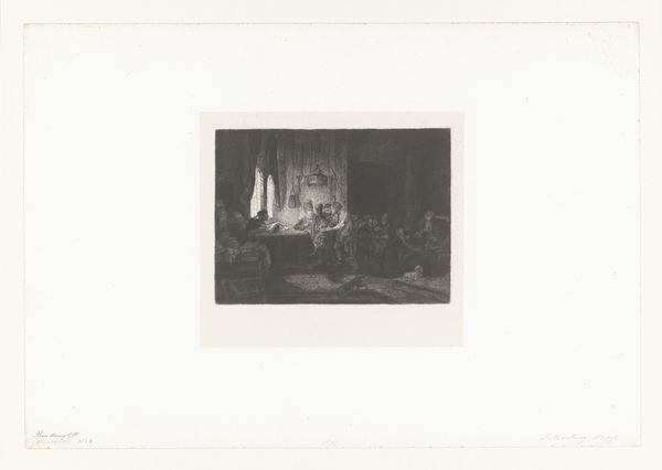 This is "Een boerendeel," an etching by William Unger. The print plunges us into a rustic interior, where the artist masterfully manipulates light and shadow to evoke a sense of depth. The composition is carefully structured, with the converging lines of the thatched roof drawing the eye towards the heart of the scene. Unger's use of etching brings a textural quality to the image. The stark contrasts between light and dark create a visual rhythm that underscores the simplicity and hardship of rural life. The artist's marks articulate an underlying structure that both reveals and conceals its own making. The semiotic interplay of these forms and textures doesn't simply represent a scene; it invites us to decode the cultural narratives embedded within it. This artwork is not a mere snapshot but a complex arrangement of signs that reflect on the relationship between humans, nature, and the passage of time. The image resists a definitive interpretation, sparking conversation and thought.