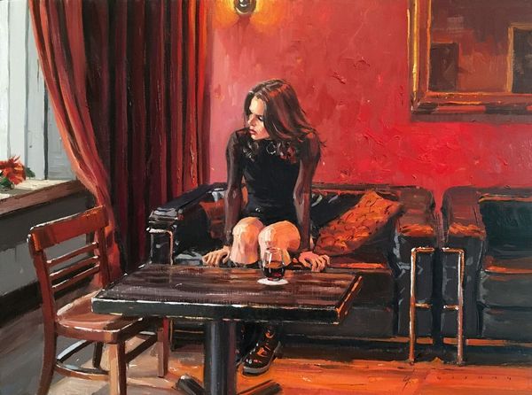 Editor: This is Vincent Giarrano's painting, "The Swift Hibernian Lounge". It looks like an oil painting on canvas, depicting a woman sitting in a bar, looking out the window. There’s a wonderful moodiness to it, contrasting the brightly lit street with the dark interior. What’s your take on this piece? Curator: Well, let's look at this from the perspective of production. It’s not just about *what* is represented but *how*. The materials—oil paint, canvas—were readily available consumer goods. That Irish stout? Another commodity. Think about the act of painting itself, the labor involved. This wasn't some unique alchemical process; it involved commercially produced paints, brushes made by workers… how does that commodification influence the 'romance' that’s traditionally read into it? Editor: So you're saying the readily available materials challenge a romantic reading? How so? Curator: Exactly. The painting shows us a scene of leisure and quiet contemplation, but look at the sign of 'Jameson' right behind her. Isn't leisure a product of labor, of certain social and economic systems? The very fact that the scene can be easily replicated and sold challenges notions of unique artistic vision, doesn't it? The brushstrokes themselves become a product, part of the market exchange. Does knowing all this affect how we value the 'fine art' aspect of the "fine art portrait" the AI labels it as? Editor: That’s really interesting. I hadn’t considered the implications of the commercial availability of the materials so explicitly. Curator: Think of the production! How materials become images, and those images in turn circulate within economic systems… Editor: Right! I guess seeing it as a reflection of consumer culture really shifts the way I perceive the subject's solitary contemplation. Curator: It really underlines that connection between artistic practice and the material conditions that surround it, doesn’t it? It really makes me see bars as the epitome of leisure, capitalism and consumption. Editor: Definitely something to chew on. Thanks!