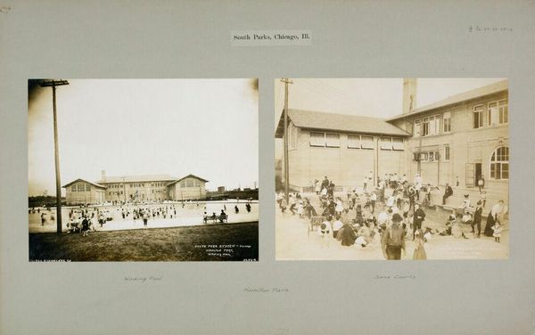 Curator: This photographic print by the Geo R. Lawrence Co., titled "Social Settlements: United States. Illinois. Chicago. 'South Parks'," offers a glimpse into early community spaces. I am struck by how different the world looked at the time of its creation. Editor: The sepia tone lends the image a sense of nostalgia, almost a yearning for a simpler time, wouldn't you agree? But there's more here than meets the eye. The placement of the park's field house and the people drinking from the fountain have so many implications. Curator: Indeed. The field house, likely constructed with readily available materials and the outdoor drinking fountain, speaks volumes about the social reform movements and the design of public spaces intended to promote communal health and well-being. Editor: Absolutely. Water as a symbol of cleansing and renewal... it's powerful. Water is symbolic of life in so many different cultures. And even something as simple as its public availability transforms into a statement about civic responsibility and shared resources. Curator: It makes you consider the labor involved in building these spaces and the social implications of creating accessible common ground. Editor: The image is really a statement. It invites us to reflect on the symbolic power of public spaces and how they shape the narrative of our communities. Curator: It's a good reminder of the tangible efforts that shaped societal well-being through built environments.