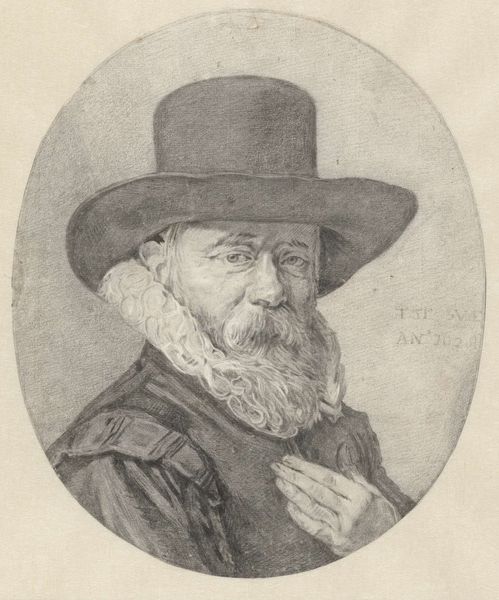 Curator: Standing before us is "Portret van een man met horloge in de rechterhand," a drawing created around 1780 by Jan Gerard Waldorp. It's currently held here at the Rijksmuseum. I must say, what jumps out at me immediately is the subtle melancholy emanating from the subject's eyes and the gentle rendering of his beard, all in pencil. Editor: Oh, absolutely, that slight droop in his eyes speaks volumes! To me, the watch becomes more than a mere accessory. It's like an early version of a memento mori—a visual reminder of mortality and the fleeting nature of time itself. Waldorp captures something deeply human here. The watch symbolizes time, but the face shows the effects of its passage. Curator: Exactly, the pocket watch feels so deliberate in this portrayal. The period of neoclassicism often emphasized rationalism, order and measured clarity, and that watch really underscores it, quite literally measuring time as it does! Perhaps there's also something deeply personal we can take from that... the preciousness of fleeting moments. Editor: Oh, certainly! Before we became slaves to digital time displays everywhere we look. Imagine the intimacy of holding this ornate piece in one’s hand. Also, considering the portrait as a whole, there’s an understated psychological weight, do you agree? That subtle play of light and shadow and all these textural nuances – from his furrows to the delicacy of his lace collar - amplify the sensation of mortality and change. The eyes also point towards the Dutch master painter, Rembrandt! What do you think? Curator: That's it... I'm starting to see it myself... that quiet, almost pleading vulnerability Rembrandt knew how to draw out... Editor: A certain emotional truthfulness! And one more point… consider what portraiture at this moment also does for a patron. If we didn’t have photos for loved ones at all times like now, this artwork functions almost as a sentimental locket might... As if, despite the cool and austere neoclassical trend, Waldorp allowed a glimpse into genuine warmth, and that pocket watch may indeed point us beyond reason, past rationality, straight toward remembering.
