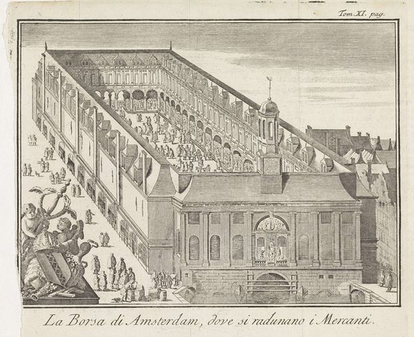 Editor: Here we have "Gezicht op het meisjeshuis van het Burgerweeshuis te Amsterdam," possibly made between 1710 and 1766 by an anonymous artist. It’s a print, an engraving, showing a view of the Amsterdam orphanage. I'm struck by the stark geometry of the courtyard and how the figures seem so small within it. What do you see in this piece? Curator: What immediately grabs me is how this image functions as a piece of civic PR. Orphanages, like this Burgerweeshuis, played a vital public role. They were evidence of a society taking care of its vulnerable, especially in rapidly growing urban centers like Amsterdam. The meticulous depiction of the architecture isn't just documentation; it's about demonstrating the institution’s solidity and order. Editor: So, it's less about art and more about… urban planning and social commentary? Curator: It’s both! This isn’t simply a snapshot; it's a carefully constructed representation, aiming to influence public perception. Notice the clean, organized courtyard, the figures are neatly arranged, almost staged. Does this reflect reality, or is it presenting an idealized view of institutional life? And how does the act of engraving, the medium itself, contribute to the image's message of control and permanence? Editor: That's a good point, an engraving suggests precision, order, even authority. So the image isn't just *of* a building, it’s making an argument *about* that building's importance. Curator: Exactly. And consider who this image was meant for. Likely for wealthy citizens or potential donors, underscoring the worthiness of the orphanage's cause. Think about the social and economic structures that supported institutions like this, and the role images like this played in maintaining that system. Editor: That recontextualizes the whole artwork; I thought it was simply an architectural print! Curator: Seeing art in its social and institutional context can completely change our understanding of it, right?