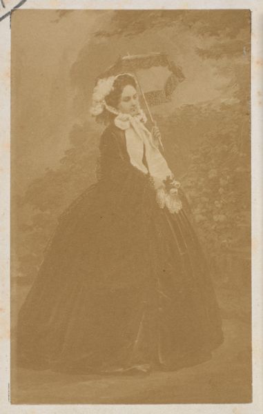 Editor: This is "La robe écossaise" by André-Adolphe-Eugène Disdéri, taken sometime in the 1860s. It’s a photograph of a woman in a plaid dress, and it gives me a slightly melancholy, reserved feeling. What do you see in this portrait? Curator: I see a commentary on the performance of identity within the rigid social structures of the mid-19th century. Consider the sitter’s averted gaze, her posture, and especially that elaborate tartan dress. It’s not simply a fashion choice. In the context of the 1860s, what might that assertive display of plaid, with its own strong cultural associations, represent? Editor: Perhaps a connection to a specific Scottish clan, or a broader statement of cultural affiliation? Was it common to photograph women in this style of dress? Curator: Precisely. Tartan held complex political meaning, and this garment situates the sitter in a historical narrative beyond mere aesthetics. Disdéri was a commercial photographer catering to a burgeoning middle class eager to participate in the visual culture of the time, so such markers became crucial to convey respectability or…something else entirely. What's this image communicating, do you think, beyond simply capturing someone's likeness? Editor: I’m thinking maybe a conscious construction of identity through symbolic fashion, perhaps reflecting aspirations or affiliations the sitter wished to project. It's fascinating how clothing can act as a powerful visual language. Curator: Indeed. And understanding the socio-political undercurrents is key to unlocking these photographic narratives. This has definitely opened my eyes to thinking more deeply about the social performance embedded within seemingly simple portraits. Editor: I agree. It's about much more than just a pretty dress; it’s a statement. Thanks for that.