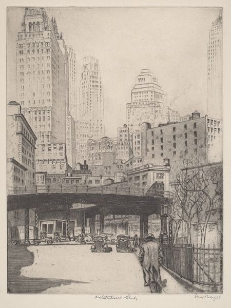 Curator: So evocative! There's a sort of somber elegance to this image; the hatching is incredibly precise, the skyscrapers recede with a hazy kind of dignity... I'd say it’s rather affecting. Editor: Indeed! Here we have George Stimmel’s “Untitled (New York Scene).” While its precise date remains unconfirmed, this drawing, etching, and print captures a pivotal moment of urban transformation, likely from the early to mid-20th century. Curator: Tell me more about that transformation, what makes it “pivotal”? Editor: Look at the visual grammar! The elevated train line dominates, physically and symbolically dividing the space. Above, the monumental skyscrapers suggest aspiration, ambition, the capitalist drive skyward. But below, the street-level scene hints at something less idealized: truck traffic, cramped spaces, the more grounded realities of the city. The el train, then, serves as a kind of gate, the point where we confront different facets of progress. Curator: Yes, there is certainly something gate-like here: That ironwork possesses such rigidity, such pattern, especially against the hazy, almost ghosted skylines beyond! I also feel a strong current of classic urban iconography present here, specifically in how public transport like this references turn-of-the-century social anxieties... How this image is really of that historical tension and less simply "New York." Editor: Exactly, these infrastructures take on outsized symbolic power! I might even add a sense of collective tension—are we looking at an optimistic future or a world burdened by its relentless pace of development? Those line techniques Stimmel employed really speak to the human need to represent something far bigger. Curator: A tension, though! Even the title is charged. It resists specification; perhaps suggesting the experiences within were far bigger and broader. The artist resists that sort of constraint. Editor: So instead it becomes all of New York, the essence of that place and time. Well, after this conversation I will surely spend time thinking about that. Thanks. Curator: Absolutely. An experience far broader and, therefore, perhaps, also more accessible. Thanks, it has been illuminating for me as well.