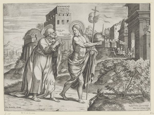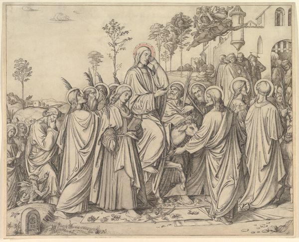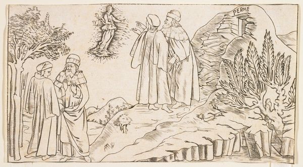 Curator: The piece before us is titled "Emmaüsgangers" attributed to Gijsbertus Antonius Sluijters, dating sometime between 1857 and 1927. It appears to be executed in ink, perhaps as an engraving or drawing. Editor: It strikes me as quite somber. The limited palette and the linear quality lend it a rather serious tone, reminiscent of older biblical illustrations. There's a definite emphasis on the figures and their poses. Curator: Indeed. Considering its historical context, we can appreciate the laborious process required for such detailed line work, which demanded both precision and skill. The engraving likely allowed for wider distribution of this religious scene among the populace. Editor: Absolutely, the formal elements contribute directly to the narrative's legibility. The contrast between the ethereal glow around the figure on the left and the hunched posture of the men evokes the themes of revelation and perhaps disillusionment. Curator: We might also think about the engraver's choice to adopt a style evocative of the medieval period, invoking historical authority and a sense of timeless truth. Was this intended to reinforce the established church, or to subtly critique its relationship to material culture and art production? Editor: Interesting point. From a purely structural viewpoint, the landscape in the background serves not just as context, but as a visual counterpoint. The sharp angles and stark lines form a rigid grid. This is offset by the flowing robes of the figures to invite a dialogue on salvation and belief. Curator: Further exploration might uncover which printmaking workshop or patron commissioned Sluijters to create this image and its distribution channels. This understanding would give insights into the artist’s place within the larger industry of devotional image making. Editor: A study of the interplay between light and shadow would reveal its engagement with the central concept of this illustration. Sluijters prompts an interpretation that goes well beyond a literal narrative depiction, inviting reflection on human insight, as viewers attempt to decipher their presence within its overall layout. Curator: Precisely. It's through that interaction of maker, material and viewer that art's larger meaning becomes knowable. Editor: Yes, by decoding this interplay of visual forms, historical references and technical skill, one gains richer insights on the nature of both image and its function within society.