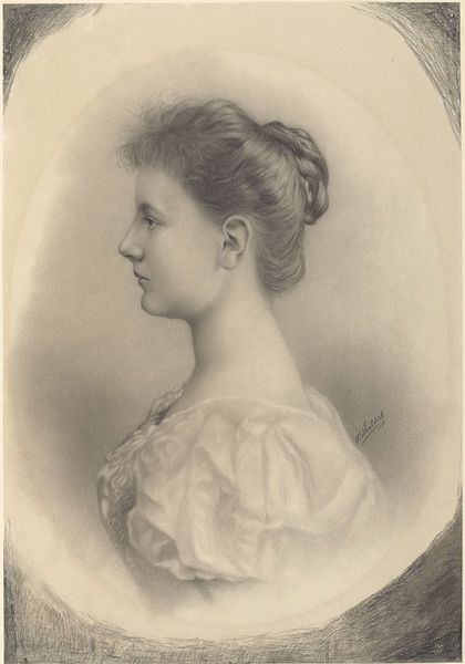 Editor: Here we have Adolphe Zimmermans' pencil drawing of "Portret van Wilhelmina, koningin der Nederlanden," created between 1897 and 1899. It's striking how this delicate drawing captures such regal poise, but with an almost vulnerable air. What visual cues tell a story beyond just portraiture here? Curator: Indeed. Beyond being a rendering of a future queen, the choice of pencil as medium speaks volumes. The subtle shading, the deliberate fragility – pencil suggests impermanence, a fleeting moment captured. Note also how Wilhelmina's gaze, averted, creates a sense of introspective depth. It echoes a transition—a young girl on the cusp of embodying a weighty crown, doesn't it? Editor: Absolutely. That sense of transition… It’s really amplified by the sketch-like quality. Was this perhaps a study for a larger work? Curator: Possibly, but consider the alternative: Zimmermans, consciously or unconsciously, presents the soon-to-be Queen not as a fixed icon, but as an evolving symbol. Think about the symbolic weight of portraits through history; this drawing gently subverts that expectation. Her youth is present. The drawing's light, airy feel mirrors the Dutch spirit itself—strength tempered with grace and openness. Does this resonate with your view? Editor: It does. I was initially focused on the perceived vulnerability, but the ‘evolving symbol’ reading gives such a richer, culturally grounded perspective. Curator: The beauty lies, doesn't it, in how seemingly simple artistic choices resonate with broader cultural narratives. Look closer – see how much a pencil line can convey! Editor: It definitely makes you think about portraits in a different light! I’m grateful for your thoughts. Curator: And I, for yours. Together we've unveiled new symbolic depths!
