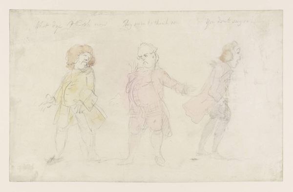 Editor: Here we have Henry William Bunbury's sketch, "Six Heads, One that of a Woman in a High Headdress." It's a pencil drawing, and it feels almost like eavesdropping on a private sketchbook. What do you make of this array of characters? Curator: It's like catching whispers from the 18th century. I love how Bunbury gives us these fleeting glimpses, almost caricatures, really. The woman with the towering headdress--isn't she magnificent? There's a touch of social satire, perhaps? A little poke at the extravagance of the time? Editor: It definitely feels playful. Curator: Exactly! It's loose, gestural, and hints at stories untold. One wonders what Bunbury was thinking while he sketched these delightful souls. Editor: I see it now, thank you. I’ll remember Bunbury’s wit the next time I see a towering wig.