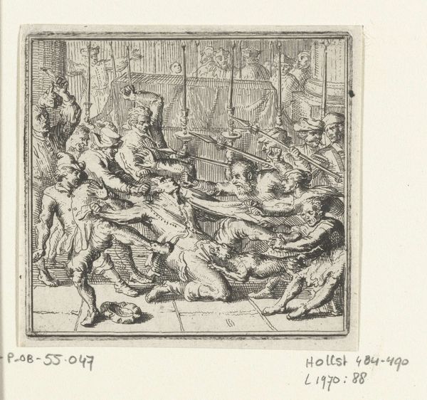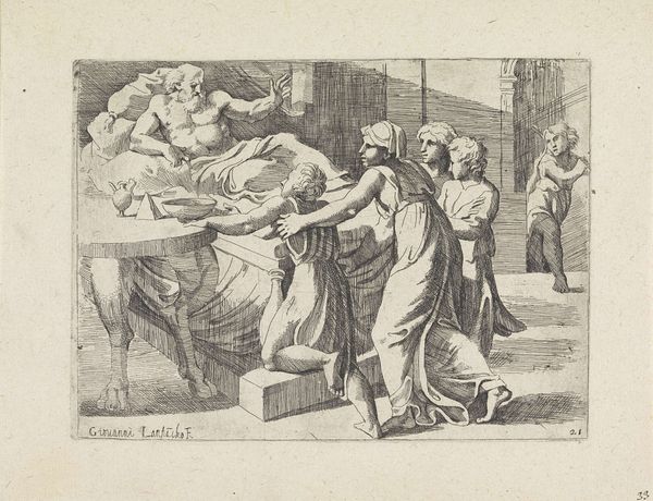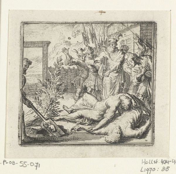 Curator: Let's examine this print, "Illustration for Boccaccio's Decameron," crafted in 1697 by Romeyn de Hooghe. It's currently held here at the Rijksmuseum. Editor: Wow, just at first glance, what a chaotic and slightly unnerving little drama! The way everyone is gesticulating – it’s like a frozen explosion of emotion, yet rendered so precisely. Curator: Absolutely. The engraving and etching techniques, characteristic of Baroque line art, serve the narrative directly. We're observing De Hooghe's skillful application of the medium to visualize one of Boccaccio's intricate tales. The choice of printmaking democratized access to narrative art at the time, didn't it? Editor: Exactly! And that accessibility invites closer scrutiny. Look at the central figure reclining; is he supposed to be ill, or perhaps… dead? There's a baby being presented, a monk with a book—it's ripe for wild speculation, don’t you think? It is calling my inner storyteller out to play! Curator: Precisely. And the artist certainly makes use of material culture to embed this scene in the late 17th century. The figures’ attire, for instance, offers social clues about the characters’ class standing. Editor: Mmm, like theater, everything here is a costume, a prop—intended to advance the narrative. Speaking of storytelling, the glimpse through the doorway to what I can only assume are onlookers, further amplifies the feeling that we’re eavesdropping on something forbidden or crucial. It's staged, isn't it? Life as theater and vice versa! Curator: Very much so. And understanding these visual languages used throughout is fundamental to truly appreciating not just the piece but the broader societal values that De Hooghe, as a producer of images, was reinforcing and even questioning through his craft. Editor: In that moment, this image suddenly went from a curious historical tableau to a critical piece of visual commentary on class, culture, and, honestly, just wonderfully delicious human drama. Curator: Yes, it offers us an intriguing window into the artistic production and material culture of the Baroque era. Editor: Agreed, I think it does all of that while somehow still feeling intimately relatable. It really sings!