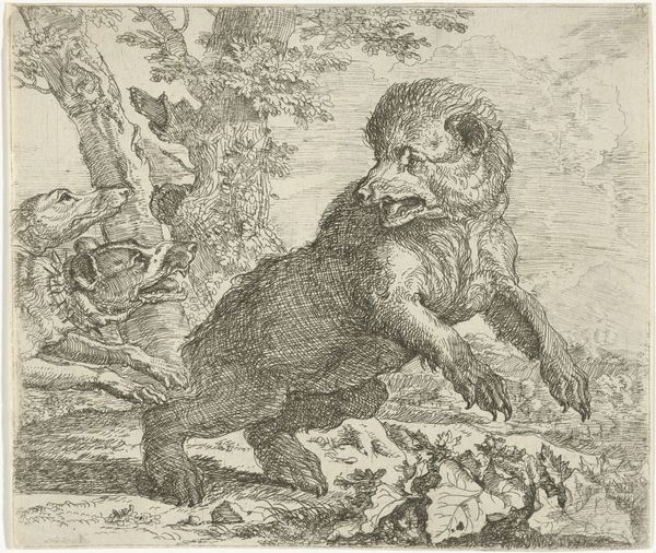 Editor: We are looking at "Zwijnen bij een hok," or "Pigs by a Sty," an etching dating from around 1654 to 1670, by Richard Gaywood, currently held at the Rijksmuseum. There is something very domestic, almost portrait-like, about the animals despite being in a pastoral setting. How do you interpret this work? Curator: The beauty of this piece, as with much of Dutch Golden Age art, lies in its technical execution. Consider the linework: economical yet descriptive. Note the clear separation between the space occupied by the nursing pigs under the sty, and the lone animal drinking; between the foreground, the immediate setting, and the subtle indication of open fields and other creatures in the distance. Do you see how line directionality, density, and pressure communicate spatial depth as well as textures? Editor: Yes, I see that! So it’s less about what the subject matter *is* and more about *how* it’s rendered? Curator: Precisely! Observe how Gaywood employs hatching and cross-hatching to generate tonality and shadow. Where does he concentrate the densest patterns of line, and what effect does this produce? How does he vary his marks? What does the interplay of light and dark achieve? The entire composition works as a structured visual scheme to emphasize form and suggest volume. Editor: He uses more dense lines where the light is blocked, like within the shelter where the sow and piglets huddle, creating darker values which creates a focal point. Also, there’s very little detail in the sky. It gives a sense of expansiveness. Curator: Exactly. The reduction of details for sky and distance allows for concentrated focus on the foreground activities of these animals and this sheltered enclosure, emphasizing the present and tactile. Editor: I never thought about prints this way. Now I see how powerful the compositional structure can be. Curator: Indeed. Focusing on its formal properties gives us insights into how it operates aesthetically, how it communicates visual experience in the here and now.