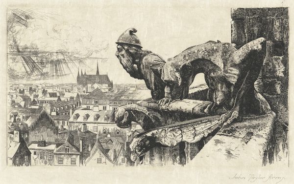 Curator: John Taylor Arms created this etching and engraving, "Guardians of the Spire," in 1921. The title refers to the gargoyles perched high above a city. Editor: They certainly have a solemn, watchful presence. The muted palette contributes to a sense of antiquity, doesn’t it? The gargoyles seem almost organic to the architecture. Curator: Arms was known for his meticulous technique and fascination with gothic architecture, imbuing structures with symbolic weight. Gargoyles, of course, were initially designed to divert rainwater away from the sides of buildings. But they quickly adopted a secondary purpose. Editor: To ward off evil spirits. Their symbolism blends protection with a slightly sinister edge. I notice how Arms employs sharp, precise lines to define their forms. The contrasting light and shadow enhances their three-dimensionality. The city seems hazy by comparison. Curator: Exactly! This technique focuses our attention, evoking a sense of history and timelessness. These gargoyles weren't just functional; they embody spiritual and psychological safeguarding for those within the city. It connects to very ancient concepts of guardians and territorial protectors in human societies. Editor: Do you think the scale of the image affects its reception? This looks like a relatively small print, doesn’t it? Its intimacy invites closer inspection of these structural components, turning potentially grotesque forms into subjects of beauty. The texture of the stone, the slight asymmetries... it’s captivating. Curator: I agree. By isolating the gargoyles against the city, Arms allows them to emerge from their purely architectural role to symbolize more—a persistent cultural need for protectors. Even now. Editor: I think this print resonates because of the stark contrast between vulnerability and architectural mass, a meditation on how we build security around us. The way the artist juxtaposes rough stone against the detailed skyline certainly amplifies this feeling. Curator: The print reveals layers of symbolic protection, reminding us of humanity's enduring quest to safeguard itself from visible and invisible threats. Editor: And the sheer formal skill allows these "Guardians" to command attention, even across the century.