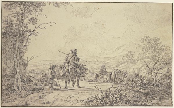 Editor: Take a look at Nicolaes Berchem’s etching, "The Bagpipe Player," created around 1644-1645. It's currently held at the Art Institute of Chicago. The print captures a pastoral scene, and there’s almost a humorous quality to it – a travelling musician and his companion encountering cattle in a landscape. How do you read this scene? Curator: I find it fascinating how Berchem uses a seemingly simple genre scene to tap into broader societal narratives. Consider the Dutch Golden Age: urbanization was booming, yet there was this persistent longing for an idealized rural past. Editor: I can see that a little in the work, how so? Curator: Landscapes like this weren't just innocent depictions of nature. They were carefully constructed images, promoting a specific vision of rural life - one of peace, simplicity, perhaps even a subtle commentary on the complexities of urban existence. The bagpipe player is the figure central in that. His position makes him seem quite proud of his craft, suggesting something deeper at work, something linked to national or perhaps civic pride, and perhaps a dose of social commentary too. What does it tell us about who controlled the creation and reception of art during this period? Editor: So, it's more than just a guy playing music in the countryside? Curator: Precisely. This is where the history of art helps understand a piece. Etchings like these were often made for a burgeoning middle class keen to acquire art that reflected their values and aspirations. It made art affordable to be shared within homes of a wider demographic of patrons. Editor: That makes so much sense now, this isn’t necessarily documenting how things were, it’s kind of like selling an idea. Curator: Exactly! And through analyzing its imagery, dissemination, and reception, we gain valuable insights into the cultural landscape of the Dutch Golden Age. Editor: Thank you so much. It gives a lot more perspective to what I saw!