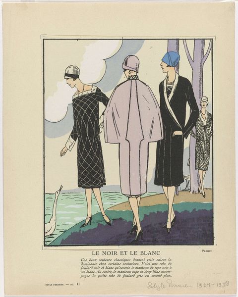 Editor: So this print is titled "Le Choix Difficile" or "The Difficult Choice", it's Plate 40 from the "Gazette du Bon Ton" in 1914, and it shows a Worth evening coat. I find it captivating how the coat almost eclipses the other figures. What catches your eye about it? Curator: It’s fascinating how Monvel focuses on the garment, its construction and place within society. Let’s think about the materiality. It's a print, reproduced for mass consumption, advertising the luxurious evening coat designed by Worth. The means of production here, printmaking, contrasts sharply with the high-end, bespoke nature of Worth's design. What does that tell us? Editor: Perhaps the "difficult choice" isn’t about selecting the coat itself, but choosing between mass-produced images versus exclusive, hand-crafted fashion. Curator: Precisely! Consider the social context as well. "Gazette du Bon Ton" catered to an elite readership. The print democratized, to an extent, the aspirational consumption of high fashion. The choice being presented here is also in part a statement about the accessibility of style via reproduction. How might this impact the fashion industry and art at the time? Editor: It creates a tension. The image becomes an object of desire in itself, while simultaneously promoting another, more tangible and exclusive object. It makes me wonder who the true audience is for art versus fashion. Curator: The boundary blurs here. Is the print art, advertising, or both? The very act of depicting the evening coat transforms it. Monvel forces us to confront these overlapping systems of value. He emphasizes labor of production in both mediums: Worth’s garment and the physical print. It underscores the labor needed for artistic creation. The social life is shaped by both these creations. Editor: I see now how the print isn’t just a pretty picture but a statement on production, consumption, and access within both art and fashion. Thanks for clarifying the cultural significance through a material lens! Curator: My pleasure. Thinking about the physical object and its journey broadens our understanding. We must remember what something _is_, not just how it _appears_.