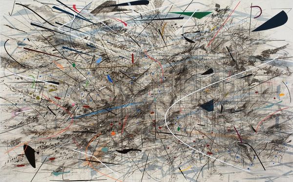 Editor: Right now we're looking at Julie Mehretu's "Excerpt (Suprematist Evasion)" created in 2003, using acrylic paint. The sheer energy in this abstract work is astounding, almost like a burst of light and color. How do you interpret this work? Curator: For me, it speaks to the power of geometric forms, recalling Malevich's Suprematism, but with a frenetic energy that suggests something else entirely. Look at the layering— it's a visual record, a kind of palimpsest of urban experience. Do you see how the lines and shapes seem to simultaneously converge and explode outward? Editor: Yes, there's a sense of movement, like a city being built and destroyed at the same time. Is that what you mean by urban experience? Curator: Exactly. Mehretu’s work often engages with the layered complexities of urban landscapes. The Suprematist title hints at a break from established orders. These shattered geometric shapes feel like a revolt against rigid systems. Do you recognize how certain lines are bolder and more prominent than others? Editor: Yes, those lines stand out. Curator: Perhaps representing major arteries or pathways through our mental cityscapes, personal mythologies projected in a collective manner. How do the colors impact you, and their role in guiding your sight? Editor: I feel the yellows and reds draw the eye through what would otherwise be chaotic. The blue feels colder in the background... so you see those are emotional signals too, maybe? Curator: Indeed. Notice how the vibrant, assertive lines clash with the paler background, evoking a struggle or tension between different layers of history and experience. They can exist harmoniously, so where is the rupture occurring for you, personally? What historical symbols feel challenged or lost? Editor: That’s such a helpful insight – it definitely reframes my initial feeling of just raw energy. Now I am pondering personal memories, even social anxieties projected onto a wider historical perspective. Curator: And, to me, this artwork remains fascinating to see evolve our conversation within us as it speaks to others, continually changing, challenging us, making art still alive.
