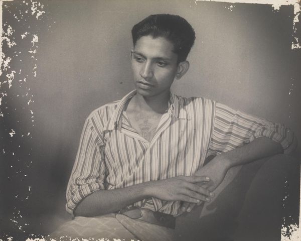 Curator: Here we have an untitled portrait by Lionel Wendt, the Sri Lankan photographer, active in the early 20th century. Editor: There's something immediately intimate about it. The way he's just sitting there, looking slightly off-camera, almost resigned. Curator: Observe how Wendt masterfully uses light and shadow, creating a sense of depth and texture, particularly in the contrast between the subject's skin and the patterned fabrics. Editor: It’s funny, the formal pose, juxtaposed against the informal attire, gives it a candid feel, almost as if he were caught between worlds, dressed, but still barefoot. Curator: Indeed. The composition, with its strong verticals and horizontals, creates a balanced yet dynamic image, guiding the eye through the various planes of the photograph. Editor: Ultimately, the gaze evokes melancholy. Curator: A poignant observation. Editor: Yes, but there is a beauty in the stillness, isn't there?
