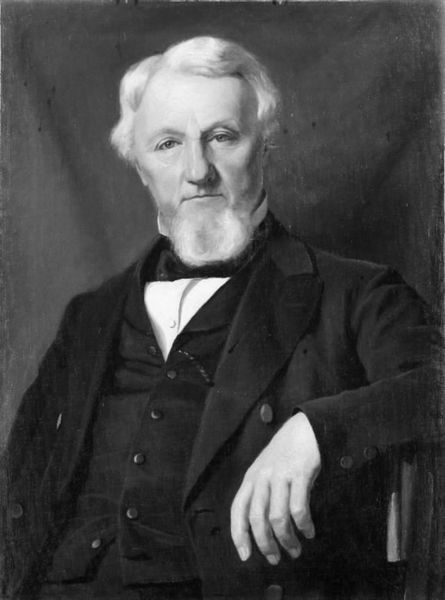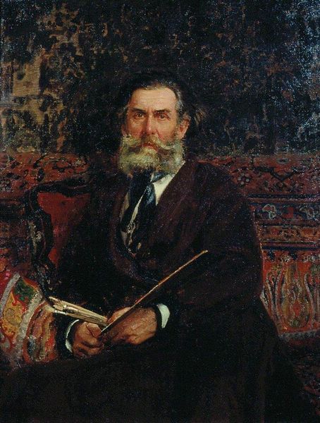 Curator: Ilya Repin completed this portrait of Ivan Turgenev in 1879. The famed novelist sat for the Russian artist in Paris. Editor: What immediately strikes me is the almost melancholic, subdued palette. The deep blues and grays create a somber mood, yet Turgenev's face holds a certain warmth. Curator: Absolutely. It is crucial to remember the political climate in Russia at the time. Turgenev was a key figure in introducing Russian literature and progressive ideas to the West, and portraits like this played a role in shaping his image as a cultured, European intellectual. Editor: The texture in Repin's work is fascinating. Look at the layering of oil paint, particularly in Turgenev's beard and hair. There’s a real sense of depth and volume created through the contrast of light and shadow, that adds to the humanity of the figure. Curator: And his prominence. Repin was invested in presenting Russian figures within an accepted artistic format that would make them important and appreciated throughout Europe. You see the same tactic employed by others invested in increasing cultural exchange. Editor: True. It is a dance between representing the man himself and presenting him as a representation of his class and role. There's almost a sense of… calculation? His gaze is direct, but softened. The hand gestures suggest contemplation and thought, not raw emotion. Curator: His choice to portray intellectuals elevated the role of art itself, emphasizing the importance of art in cultural and political discourse at the time. Editor: It certainly emphasizes his standing in the Russian arts community. Considering the composition as a whole, Repin skillfully leads our eye through contrasting textures—from the soft beard to the rough handling of the dark blue backdrop. The artist builds a harmonious, and very somber experience for the viewer. Curator: And perhaps subtly reinforcing the seriousness of Russia’s presence in European arts circles. Thank you for these astute observations. Editor: My pleasure. It's these nuances of style that help unlock some understanding of the artist and his world.