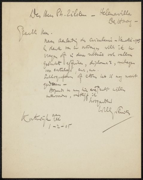 This letter to Philip Zilcken, by James McNeill Whistler, is made with pen and ink on paper. While seemingly simple, the choice of materials speaks volumes about the artistic process and social context. Whistler, known for his etchings and paintings, often blurred the lines between fine art and craft. Here, he engages with the everyday act of writing a letter, elevating it through his distinctive style. The fluid lines and delicate strokes of the pen reveal Whistler's mastery, transforming a mundane task into a work of art. Paper, a widely available material, becomes a canvas for his thoughts, while the ink captures his nuanced expression. The act of writing, a skilled practice in itself, becomes a means of communication and artistic expression. It reminds us that art can be found in the most common of places. This letter challenges traditional notions of art by embracing the everyday and highlighting the beauty in the act of creation itself.