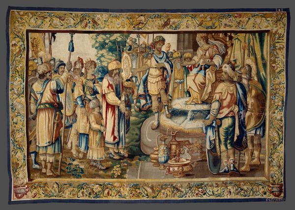 Curator: Here we have a baroque tapestry, "The Meeting of David and Abigail," crafted circa 1610-1620 by François Spiering. Notice how the composition directs our gaze from left to right, detailing the biblical narrative. Editor: Wow, it feels like stepping into a dream, all soft blues and greens. The detail is incredible, especially for a textile piece. Makes me wonder about the person who wove it, sitting for hours bringing this scene to life. Curator: Indeed. The medium itself, the weaving, introduces a layer of complexity. The warp and weft create texture and imbue the image with depth that a painting might only suggest. Consider the deployment of figuration, too. Editor: I am immediately struck by the figures; some are almost rigid, proper, while others lean, kneel, seem so much more desperate or relaxed. Do you see the guy kneeling? Makes me wonder what kind of story it suggests to viewers? Curator: The narrative art is central to understanding its impact. Spiering uses the visual language of Baroque art to elevate this history painting beyond simple illustration. Semiotically, each figure functions as a signifier. David represents kingly power, Abigail is grace. Editor: Kingly power… grace. Makes you wonder how different they’d be without the costumes and the context. I bet they argued about who took out the garbage just like anyone else! It really humanizes it for me. I wonder if viewers relate it all back to their experiences, you know? Like a Rorschach test with thread? Curator: A provocative comparison. One can certainly consider the affective dimension; however, the objective reading understands that in this scene we can identify symbols of power through his pose and the reactions. The Baroque sought to create grandeur through drama. Editor: And thread. Let’s not forget the threads and hands it took to make it. Still, the human elements and the historical, weave together to leave me impressed. Curator: Yes, quite. It is an accomplished representation from a specific, intentional Baroque perspective.