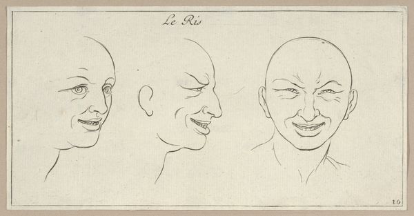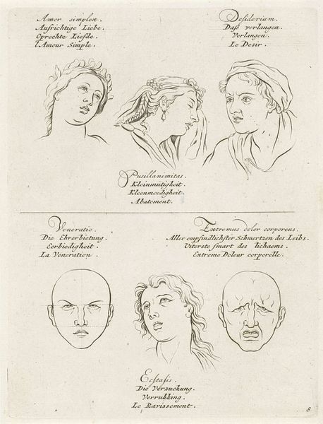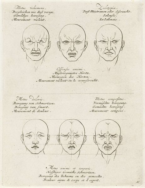 Editor: This print, titled "Gezichtsuitdrukkingen van vrees, verachting, schrik, verwondering, medelijden en geweldige beweging," was created sometime between 1692 and 1711 by Pieter Schenk. The Rijksmuseum holds it. The collection of sketched faces is so compelling, even now! How do you see the cultural and material elements in this piece? Curator: I look at the work and see how the very process of making prints—the repeatable image, the accessibility of multiples—democratized the study of emotion. Before photography, how else did people access and dissect these expressions? Schenk wasn't just an artist; he was part of a system, producing a commodity. Consider the labour involved in engraving each plate, the cost of materials, and who could afford the final print. It's a study of emotional economies. Editor: So you're suggesting the creation of these prints made emotion more accessible? I’m fascinated by how those prints could become the language of conveying social status in a material way! Curator: Exactly! It's not just about high art or aesthetics; it's about accessibility, labor, and circulation. These prints entered the homes and lives of ordinary people. What does that tell us about the cultural consumption of emotion in that era? Look at the different languages used; what purpose do they serve? Who are these accessible to? Editor: It's multi-layered and complicated. It makes me question the motivations behind standardizing and classifying these emotions; was this an accessible way to broaden one’s understandings of the world? Curator: Precisely! It is more than just art; it is material culture in action. What new questions does this perspective raise for you about other works from the period? Editor: This really changed my understanding - thinking about accessibility makes me rethink about how artistic intention meets public consumption. Curator: Absolutely, it highlights how art becomes a vehicle for social interaction and understanding through materials and labour.