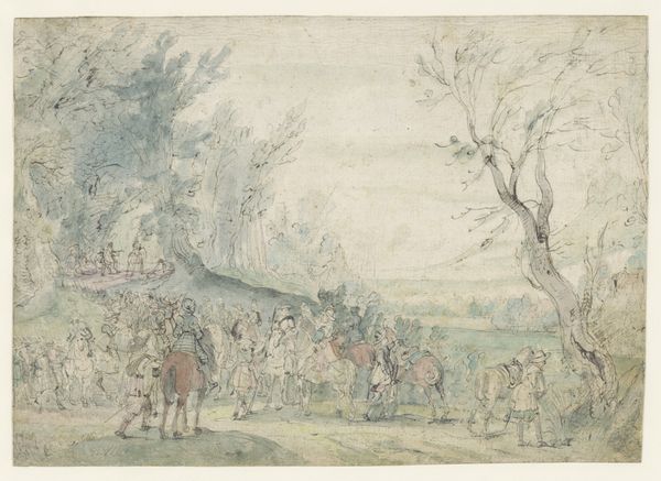 Curator: Look at the open space in this ink drawing by Jan Wildens, titled "Landscape with Falconers and Herdsman". What's your first take? Editor: The color palette, or rather, the lack thereof, creates a somber atmosphere. Despite the scene depicting people and animals in an open field, it almost feels confined and quiet, perhaps hinting at the daily struggle of people at the time. Curator: Wildens painted this scene during the Dutch Golden Age, a period defined by the rise of secular landscape art. These pieces became significant expressions of national identity. It portrays an imagined Flemish landscape that highlights a burgeoning mercantile class engaging in leisure activities such as falconry. Editor: I notice that despite being labeled as 'leisure,' the activity is rooted in a social hierarchy and access to resources, evidenced by those engaging in it as opposed to the many in the background moving sheep along the path. It prompts us to consider not just national identity, but also the disparities within society that the art might subtly, or not so subtly, reflect. Curator: Absolutely. Consider the cultural and economic transformations occurring then. Falconry, a sport of the elite, finds itself set against a backdrop of more agrarian work. Wildens masterfully integrates social layers. It highlights a very specific class identity through both leisure activities and implied economic standing. Editor: It makes you think about the choices, conscious or otherwise, artists make and how those decisions can perpetuate or question the accepted norms. How the visual representation of leisurely pastimes juxtaposed against working landscapes might implicitly comment on societal equity and wealth distribution. It is like he is saying look at this scene: there are always some who watch. Curator: Yes, exactly. What remains striking is its simplicity and stark representation. It's this rawness that allows modern viewers to reassess Golden Age art, taking it beyond pretty pastoral images and bringing socio-political elements into the conversation. Editor: I think viewing this artwork helps to challenge our contemporary definitions of both labor and leisure, especially regarding who gets to do what and what they represent. Curator: Ultimately, that allows us to contextualize this beautiful ink drawing within wider issues concerning environment, class, and the narratives that art silently tells.