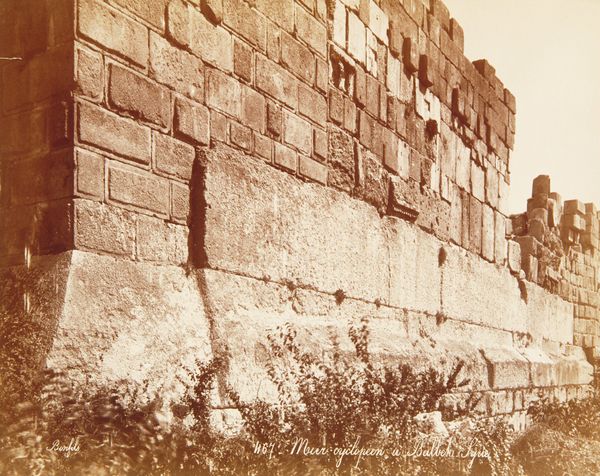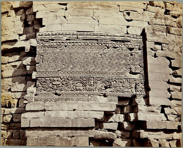 Curator: Let's consider Samuel Bourne's "Benares, Floral Carvings on Do-Do," a 23.7 x 29 cm photograph currently housed at the Harvard Art Museums. Editor: The monochromatic palette really highlights the textures. It feels weighty, almost crumbling, yet those carved floral elements suggest delicacy. Curator: Indeed. The sharp contrast emphasizes the formal tension between decay and ornament. Note how Bourne frames the composition; the architectural elements are not merely represented but presented as a study in relief and form. Editor: I'm struck by the labor involved—the quarrying, the carving itself. The photograph flattens it, but I imagine the scale and physicality would be imposing in person. What kind of tools did they use, and how long did such intricacy take? Curator: Precisely. The act of photographic reproduction mediates that labor, transforming the object into an image, shifting our focus to the visual structure rather than the manual process. Editor: Still, thinking about the hands that shaped these stones, that is what connects me to it. Curator: A fitting connection, given the enduring questions of time and craftsmanship that both the structure and Bourne’s photograph pose.