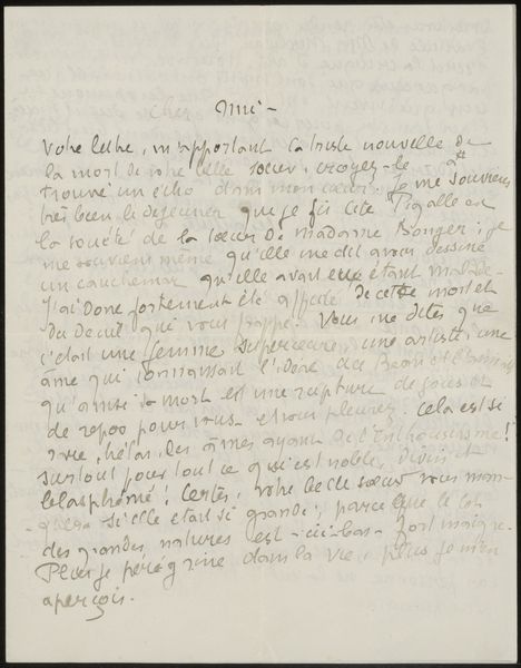 Curator: Well, "Gedicht uit archief Jan Veth," Poem from the Jan Veth Archive" dating to sometime between 1865 and 1930. It's ink on paper and textile and is a handwritten poem. The poem is intriguing and seems a little gloomy... there’s a powerful emotionality in those swirling lines. What do you see in this piece? Editor: I'm drawn to the handwriting, that calligraphic style. It feels like a very personal, intimate object. Curator: Precisely! It's fascinating to consider handwriting as a direct extension of thought, almost like a fingerprint of the mind. And in this case, that looping script certainly amplifies the poem's intense atmosphere. The strokes have their own kind of wildness. This piece breathes intimacy, wouldn’t you agree? The connection to textile is equally interesting. It asks if words offer any protective comfort against the world, much like a garment. What do you make of this? Editor: The textile connection really deepens that sense of vulnerability. The poem itself speaks of "blood is his garment"—that image is both powerful and a little unsettling. I think the combination really blurs the line between text and experience. Curator: Beautifully put! I also wonder if the poem's handwritten form pushes against the permanence we often ascribe to writing. Each word feels fluid, subject to change, much like the very time it describes. As we read the poem, it vanishes, just as time escapes our grasp. What does the handwritten format make you reflect upon? Editor: I had only been seeing it as a historic handwritten relic! The piece is a reflection on ephemerality, written in a transient form! I like how the medium deepens the message itself. Thank you! Curator: The beauty is often in the reflection of perspective! It’s truly an honour and privilege to muse alongside you.