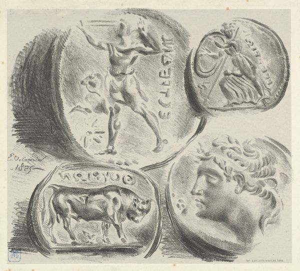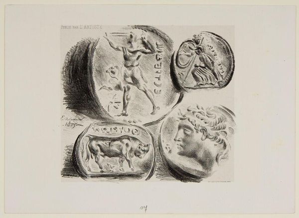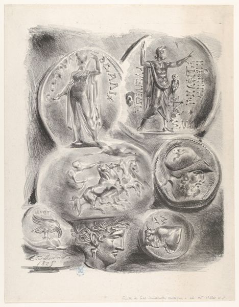 Curator: This delicate pencil and graphite study is titled “Studies of Twelve Greek and Roman Coins” by Eugène Delacroix, created in 1825. It’s currently held at the Metropolitan Museum of Art. Editor: They’re so beautifully rendered! Look at the way the graphite captures the subtle light on the metal surfaces, suggesting their weight and coolness. Almost sculptural, wouldn’t you agree? Curator: Absolutely. What fascinates me is Delacroix's conscious engagement with antiquity. In the early 19th century, there was a resurgence of interest in classical art, a direct response against the dominant academic traditions. Editor: It makes me wonder about his process. These weren't mass-produced coins, I imagine, so each one he studied demanded slow, careful looking. He really seemed to relish working with a seemingly mundane material. Curator: The creation of prints, then, was instrumental in democratizing access to these treasures and disseminating classical ideals far beyond aristocratic circles. Consider this work alongside period engravings, intended for a growing middle-class audience, eager to claim access to high culture and historical precedent. Editor: Exactly. It is interesting that he does not arrange the coin studies chronologically or according to a specific geographic distribution. By clustering these objects, is Delacroix inviting us to explore these objects not as instruments of power and trade, but as aesthetic artifacts? Curator: Yes! The layout itself emphasizes form and artistic investigation rather than historical precision, further asserting the Romantic idea of artistic license over academic constraint. In the public sphere, it spoke volumes about shifting authority, of artist as the determiner of cultural value. Editor: Looking closer at the details and his rendering style, I see the connection to metalworking processes as a laborious process of shaping material. Each coin, shaped in the hands of laborers, stamped and circulated—there’s an undercurrent here connecting labor and representation that goes beyond a simple act of historical documentation. Curator: An insightful observation that goes well beyond the study of art history! His work embodies the shift towards prioritizing the artist’s subjective experience and asserting the value of individual interpretation. Editor: Ultimately, what began as studies transcends the material. Curator: And, opens a window to broader cultural shifts that redefined the artist's role and aesthetic appreciation.