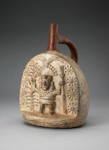 Editor: Here we have a ceramic sculpture from the Moche culture, created sometime between 100 and 500 CE. It's called "Handle Spout Vessel in Form of a Royal Messenger with the Head of a Fox." I find its hybrid form both fascinating and a little unsettling. How do you interpret this work? Curator: It's powerful, isn't it? The fusion of human and animal form in Moche art is often linked to power and social roles. Given the title, the fox imagery is key. In Andean cultures, foxes often represent messengers, but also tricksters. Considering its role as a vessel, this object likely held ritualistic significance. What might this messenger, this intermediary, be communicating within the complex Moche social hierarchy? Editor: So, the fox head on a human body suggests a specific status within the community? Does the “royal messenger” designation tell us anything further about this vessel’s role in potentially reinforcing power dynamics? Curator: Precisely. Think about how the Moche elite used ritual and imagery to legitimize their rule. This vessel could have been used in ceremonies intended to reinforce social order or perhaps to mediate with the supernatural realm. We might also ask, who had access to it? Were certain individuals excluded, and what does that exclusivity reveal? Editor: That makes me think about who got to decide the "messages" being delivered, both literally and symbolically. It seems like a potent object. Curator: Indeed. It makes us consider not only the messages being transmitted but who controlled their circulation, and the socio-political dimensions inherent within. It invites a deep interrogation of its cultural implications. Editor: Thanks, that’s a helpful perspective. It's fascinating how one object can hold so much historical and social complexity. Curator: Absolutely. Exploring the layered meanings within an artwork enhances its accessibility, turning a silent object into a vibrant site of critical discussion.