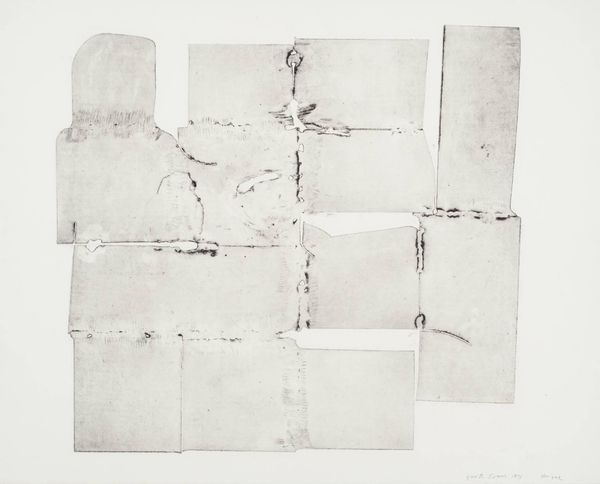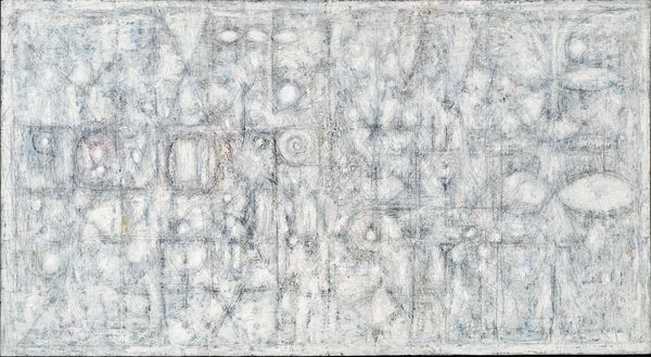 Editor: This is an Untitled piece, SFM83-338, created by Sam Francis in 1983 using acrylic paint. The overall impression I get is one of a grid, almost like a window, but with a really handmade quality. It doesn't feel precise; it’s almost fragile. What catches your eye? Curator: The materiality. Look closely at the acrylic. How is it applied? The surface isn't uniform. It is scumbled with variations in the texture, indicating the artist's hand. Note the repeated, almost mechanical application of those square outlines and the splatters of paint disrupt this grid. What does this tension tell you about the labour of producing it? Editor: So you’re saying that the *way* it was made is more important than what it looks like? That the messiness reveals the human labor that often gets erased in abstract art? Curator: Precisely! The splatters disrupt the grid’s supposed order, almost suggesting an industrial process gone awry. This wasn't a clean operation; it was physical and involved. Does it challenge conventional notions of "high art" by foregrounding these aspects of creation? Editor: I see! So, the value isn't just in the aesthetic, but in understanding the choices made with the materials, how it speaks to a dialogue between intentional order and accidental form. Curator: Exactly. We consider not just the visual result, but also the *means* through which the artwork came into being and its relation to labour. It is as much a document of action as it is a composition. It compels us to confront materiality. What do you think about Abstract Expressionism now? Editor: I guess I never considered it this way. Looking closely at process allows me to better comprehend it. Thank you! Curator: Indeed! By emphasizing materials, we unearth fresh dialogues in abstract art, shifting focus from grand gestures to grounded practice.