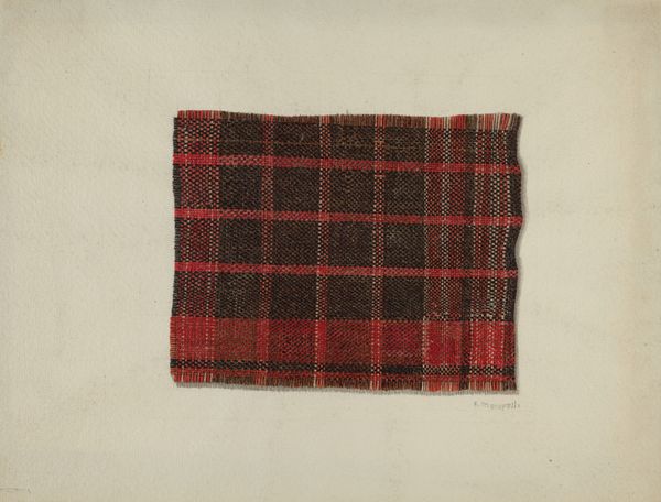 Curator: It feels very grounded. Seeing this tiny fragment of a textile makes me think about home, hearth, something deeply familiar, yet slightly out of reach in this abstract form. Editor: I can understand that reaction. We’re looking at a "Textile Sample" from around 1938 by Paul Kelly. The work incorporates drawing, mixed-media, and watercolor on a textile base—a study, if you will, rather than a final product. Curator: The colors too—a mix of muted reds, blues, and greens—evoke a certain era. Almost like a faded memory, the colors give the impression of the past, the intersection giving me a strong sensation. What sort of tradition might this pattern be pulling from? Editor: That is what is very exciting about an artifact like this—the cultural touchstones! The date places it firmly within the late interwar period, right? With the rise of abstraction, the grid becomes almost a universal language. Was this a pre-cursor to some artistic project, I wonder, or simply color play? Curator: Absolutely. The grid here isn't just a pattern, but something more foundational, and maybe the grounding sensation from it is a cultural feeling and knowledge of textile design and its purpose through many different cultures and times. Even this little snippet radiates tradition in an extremely abstract way. Editor: That's an insightful connection. As a sample, its context is key. What was the textile meant for? Was this for fashion, interior design? The broader societal need dictates its purpose and therefore, influences how we consider its value as art today. A tiny unassuming fragment holds the weight of intent. Curator: Yes, it transforms a functional swatch into something deeply evocative. This interplay, the pushing and pulling between utilitarian design and pure emotional resonance, gives it its evocative power. To feel such deep ties with so little design creates wonder. Editor: The transformation of the ordinary is what fascinates me most here, too. Examining what it reflects about 1930s aesthetics and design is intriguing. It encourages us to rethink design and its place in history as more than mere commercial or domestic choices. Curator: Absolutely! What a simple design is capable of demonstrating about cultural connection. It invites us to ponder what visual artifacts, even seemingly insignificant ones, convey and continue to perpetuate about identity. Editor: Precisely. And understanding that relationship is the heart of this visual experience, an era frozen in woven color, form and pattern for a better understanding.