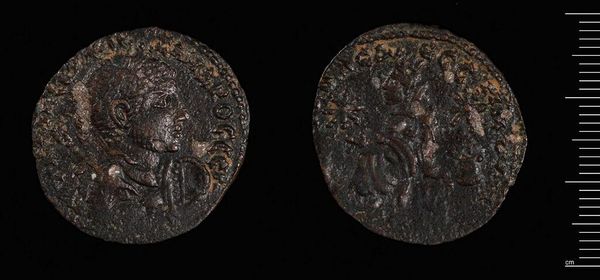 Curator: Before us, we have a coin of Thessalonike under the Empress Aquilia Severa. Editor: Immediately striking is its worn texture, the metal's surface almost like a distressed fabric. There's a palpable sense of age. Curator: The details of Aquilia Severa’s profile, despite the wear, still convey a regal authority through line and form. Notice how the engraver has used the coin’s small scale to its advantage. Editor: Beyond portraiture, coins served as vessels carrying symbols of power, religion, and cultural identity. The figure on the reverse, though faded, speaks to broader cultural beliefs. Curator: Indeed, the figure exhibits a fine balance of realistic and stylized elements, a synthesis typical of imperial art. Editor: It makes you consider what this small object signified to its original users and what echoes of that significance remain today. Curator: Precisely. Form and function intertwine to reveal a compelling narrative.